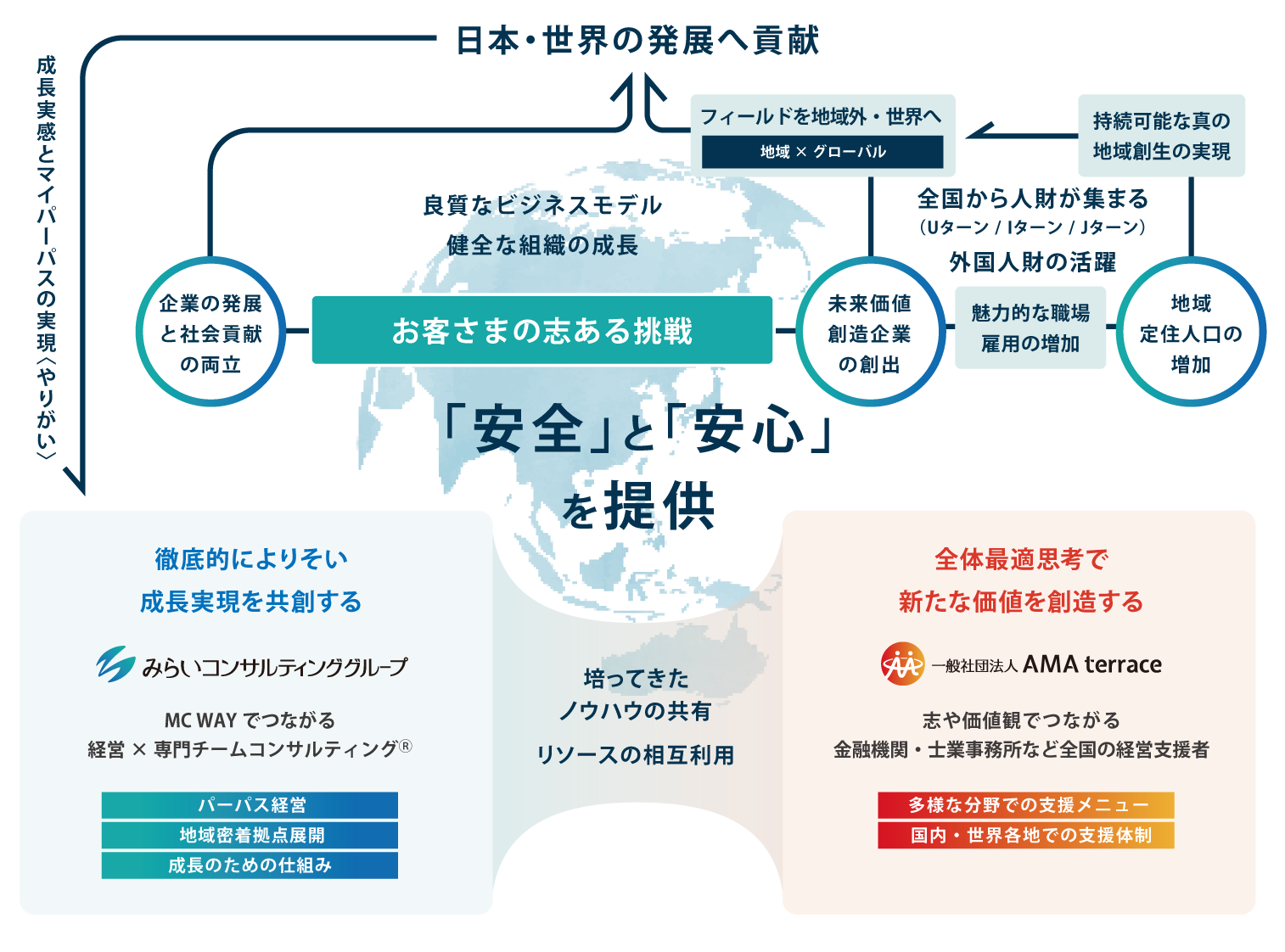 これにより、多様な分野での支援メニューと国内・世界各地での支援体制を構築し、お客さまの「志ある挑戦」に対し、「安全」と「安心」を提供してまいります。
